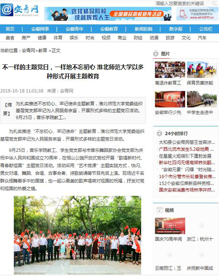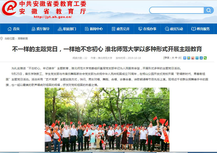 为扎实推进“不忘初心、牢记使命”主题教育,淮北师范大学党委组织基层党支部牢记为人民服务宗旨,开展形式多样的主题党日活动。《学习强国》、《安徽教育网》、《安青网》等多家媒体进行了关注和报道。