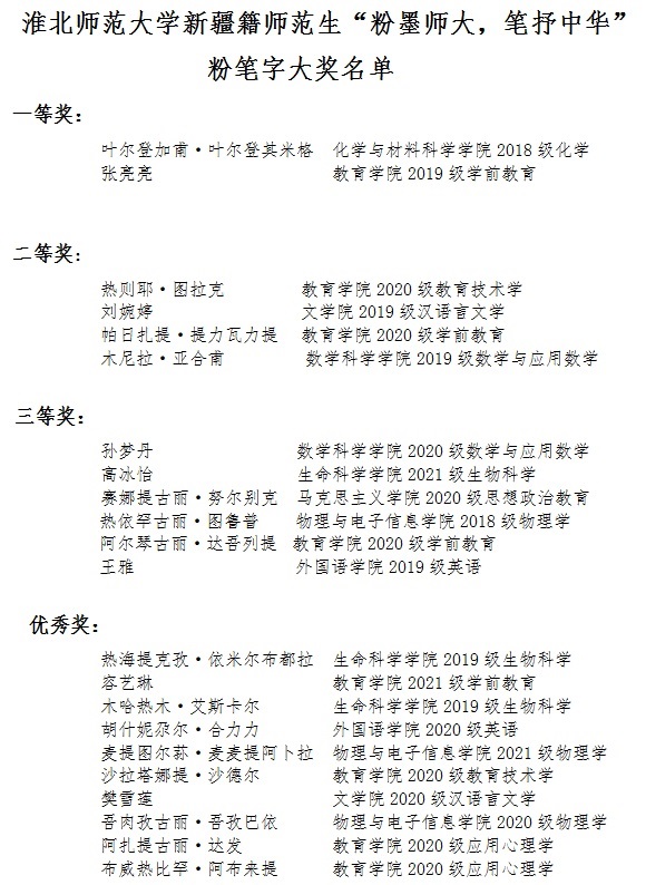 此次比赛以线上参赛方式举办。每位参赛者把自己书写粉笔字的过程拍成短视频,以电子邮件方式上交参赛作品。评委老师根据其作品书写规范、行笔运笔、字的笔锋等标准对每一位选手的作品进行打分。经过评审化学与材料科学学院叶尔登加甫·叶尔登其米格等2人获得一等奖,文学院刘婉婷等4人获得二等奖,马克思主义学院赛娜提古丽·努尔别克等6人书获得三等奖。生命科学学院热海提克孜·依米尔布都拉等10人的获得优秀奖。