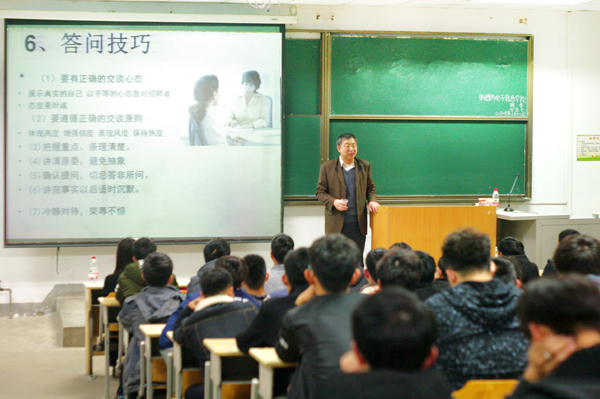 田老师围绕面试的基础知识、求职面试礼仪、求职面试技巧、求职常见问题答问技巧等四个方面展开讲解,并现场回答了同学提出的各种面试问题。