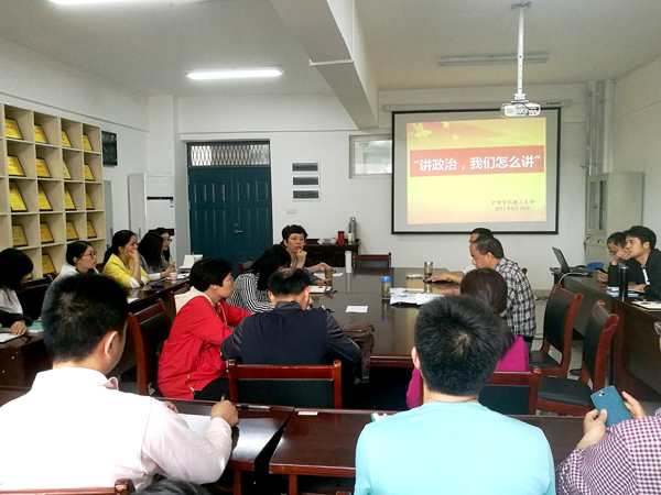 2017年5月10日下午,管理学院教工党支部在文源楼C317召开“讲政治,我们怎么讲”专题学习会,教工党支部书记王妮娜主持会议并就该专题讲党课,全体教工支部党员参加会议,学院党委书记赵卫东出席会议。