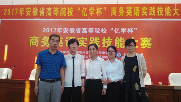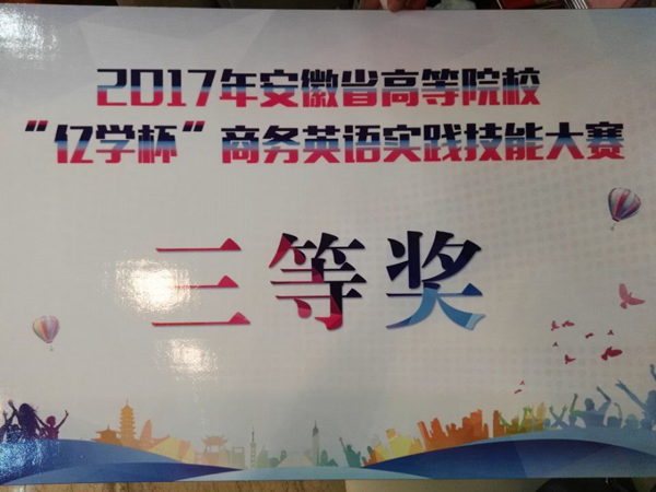 2017年5月26—27日,首届安徽省高等院校“亿学杯”商务英语实践大赛在安徽财经大学举办。我校外国学院代表队由英语专业商务英语方向的王芳、刘苏苏和魏云三位同学组成。经过26日的精心准备和27日的顽强努力,我校代表队荣获三等奖。