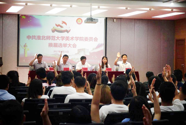 大会严格按照中共淮北师范大学美术学院委员会换届选举流程进行。首先,美术学院党委书记赵辉代表上一届党委作《扎实做好基层党委工作 力促学院事业稳步发展》的工作报告。赵辉从党的思想建设工作、党的组织建设工作、政治理论学习、党员阵地化建设、党风廉政建设、党员干部队伍建设、协调推荐学院教育教学等工作、大学生思想政治教育工作及群团工作的指导等九个方面对学院工作进行了全面客观的回顾;从进一步加强党的理论知识的学习、坚持问题导向、进一步建章立制、坚持以学生为本以教学为中心等方面明确了今后的工作思路。学院党委委员、团委书记胡天佼代表学院党委向大会作了关于党费收缴、使用和管理情况的报告。